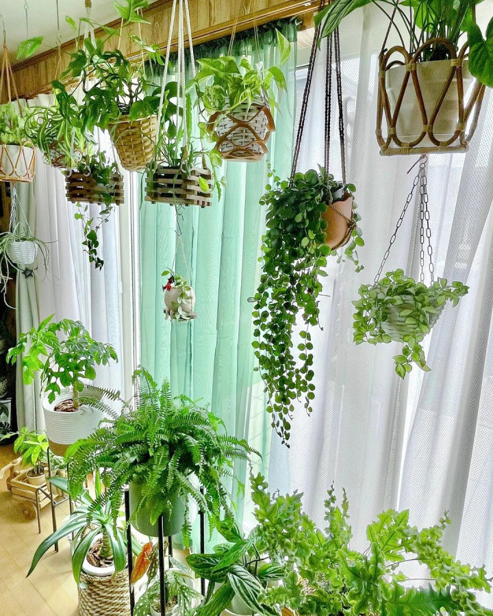 高的放角落,矮的摆脚边,垂吊的挂起来。让视线有高有低,像山峦起伏,才自然。不用追求名贵品种,好养的绿萝、吊兰、龟背竹,养好了都好看。